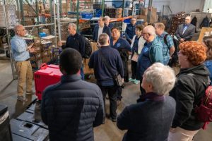 Majid Zaghari, left, vice president for enterprises with St. Vincent De Paul Baltimore, gives a tour of the Good Harvest Community Kitchen facility to leadership from the International Confederation of the Society of St. Vincent de Paul April 3 off Moravia Road. (Kevin J. Parks/CR Staff)